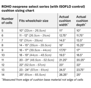 Please note that Roho cushion sizes are determined by the number of air cells across x the number of air cells from front to back. The product number (RO-QS89C) is for a cushion that is 8 cells wide x 9 cells deep. It is recommended for a wheelchair that is 14-15″ wide x 16-17″ deep. For more information on how to measure for your cushion, please refer to the View Measurement Instructions link under the picture.