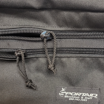 Choose from the Sportaid Jr Deluxe Down Under bag or Sportaid Deluxe Down Under bag. For use with rigid and folding wheelchairs. Fits under the seat so you can securely transport your personal items and have easy access. Release straps enable you to attach and releases bag easily. 2 Pocket zippered design with large main compartment and smaller front compartment. Zippers have pull cord to make them easy to find and operate.