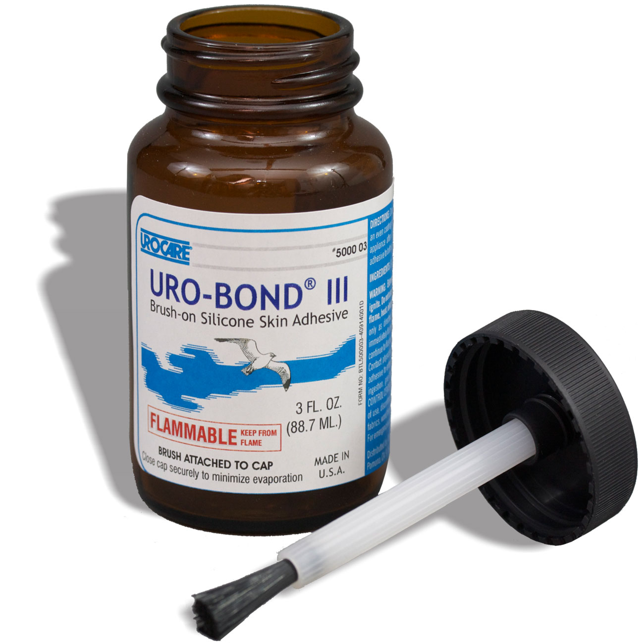 Urocare Products Inc Products Uro-Bond® III Brush-on Adhesive 1-1/2 oz Glass Jar, Silicone Based, Flammable, Water Resistant. Uro-Bond® is a brush-on, silicone adhesive used for securing male external catheters, adhering colostomy, ileostomy and tracheostomy appliances, attaching electrodes, affixing theatrical cosmetics, prosthetic devices, etc. It comes with tamper proof seal and brush attached to underside of cap.
